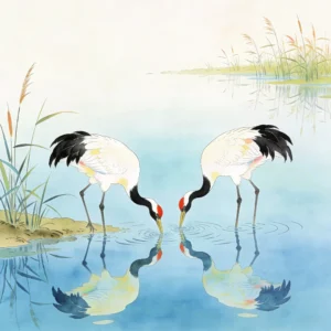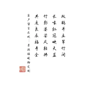 We choose the classic round porcelain plate type, which is complete and inclusive, symbolizing the harmony and completeness of the relationship. The composition of the picture is sparse and clear, and the blank space gives people infinite reverie. The protagonists in the center, the two Gongbi cranes, are the absolute visual and emotional focus. Their posture is natural and intimate, and the cascading and luster of feathers are delicately captured.