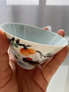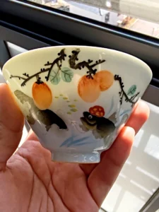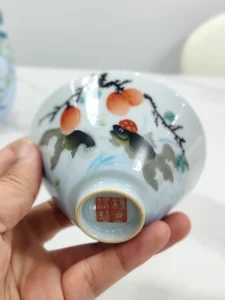 This teacup is a canvas where Jingdezhen’s 1,000-year porcelain legacy meets wabi-sabi imperfection. The goldfish swirl as if glimpsed through a pond’s surface (note: intentionally uneven brushwork for tactile authenticity), while persimmons blush like autumn moons. Unlike mass-produced decals, these motifs are painted freehand with squirrel-hair brushes, a technique comparable to Renaissance fresco sketching.