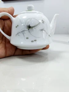 This handcrafted ceramic teapot from Jingdezhen showcases the charm of traditional Chinese porcelain with a playful twist. The white-glazed body serves as a canvas for intricate hand-painted details, depicting shrimp and crabs frolicking in a river – a scene symbolizing harmony and vitality in nature.